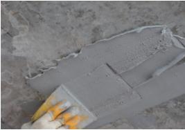 4、當(dāng)環(huán)氧樹脂修補(bǔ)膠用于混凝土表面防護(hù)(防碳化、防腐蝕等)時(shí),應(yīng)在施工前打磨去除混凝土表面浮漿、砂粒、疏松,直到粘結(jié)面露出粗骨料;同時(shí)確保混凝土表面清潔,不得有油污、粉塵等污垢、雜質(zhì),用油灰刀均勻往復(fù)涂刮至2-5mm厚。
