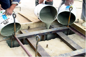 3、在支承墊石上標示出縱、橫向?qū)ΨQ支承中心線。支承墊石表面鑿毛,清除留在地腳螺栓孔中的雜物,用水將支承墊石表面浸濕飽和,但施工時不得有明水。然后在支承墊石頂面鋪一層20-30mm厚M50干硬性無收縮砂漿并夯實、表面平整,注意砂漿標高應(yīng)考慮落梁后砂漿的壓縮量。清除留在地腳螺栓孔中的雜物,并在梁就位前30min內(nèi),在地腳螺栓孔內(nèi)灌注 CGM-320A至支承墊石頂面以下15mm處。